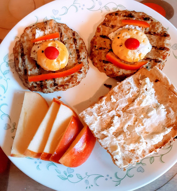 Chicken burger, yolk, lipie prăjită, cream cheese, și măr. Nu se vede castronul cu legume.