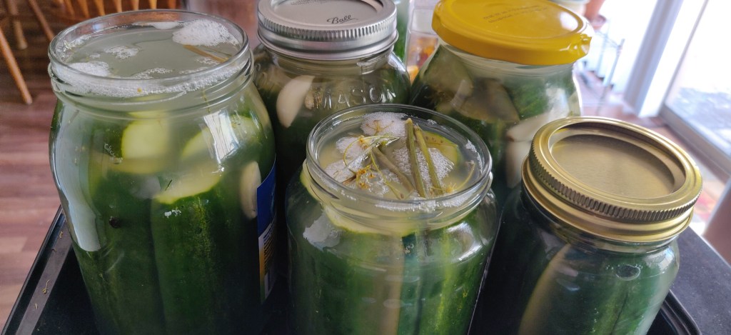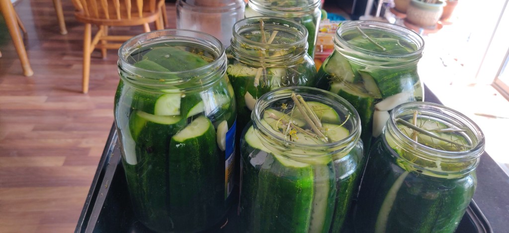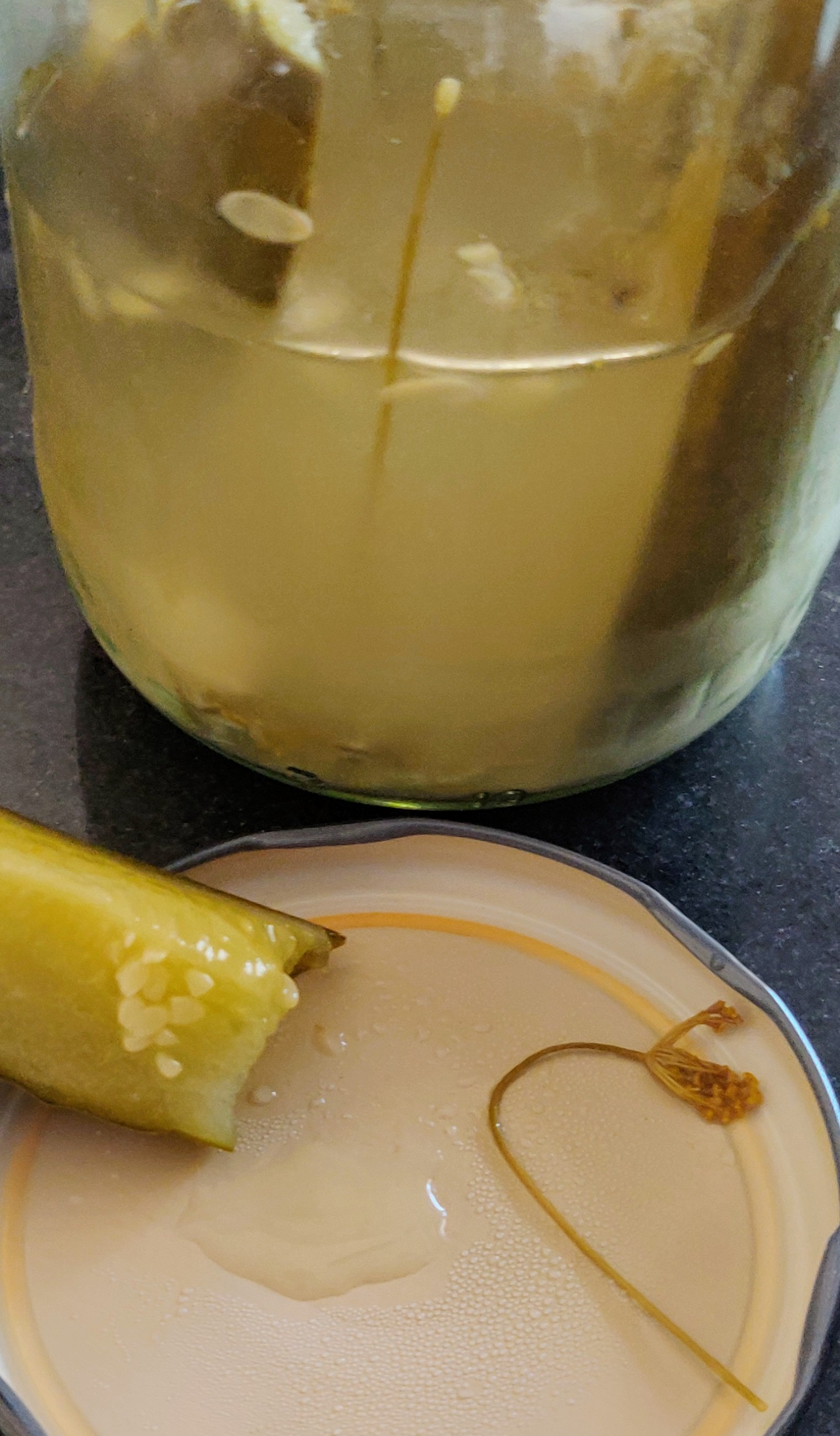 Mai trebuie usturoi, 3-4 căței medii la un borcan de 400g. Si mărar uscat. Neapărat. Mărar uscat, Mammoth Dill, ăla mare cu floare în cap, de care se cumpăra din Obor, nu uscat de ăla de mâncare. Dacă n-ai mărar, nu pui castraveți la murat. Faci țațichi.