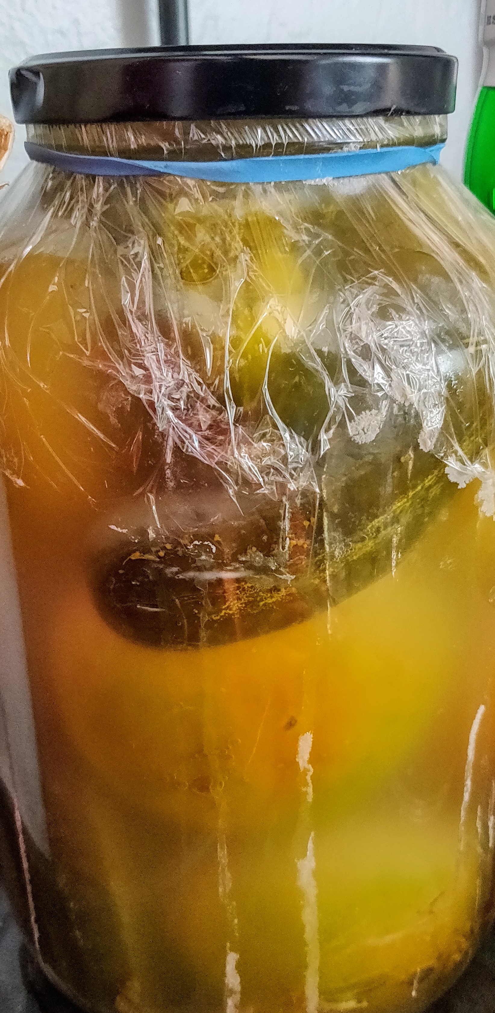 Se acoperă cu o farfurioară sau cu capacul borcanului nestrâns pentru 24 de ore. După 24 de ore dacă mai e cazul se mai pune saramură, apoi se pune folie de plastic, se strâng bine capacele, și se stă cu ochiul pe borcane. Vor fermenta, se vor tulbura, vor da un pic pe afară, dar se vor face. Nu se deschid decât atunci când se mănâncă. Stau bine la frigider.
