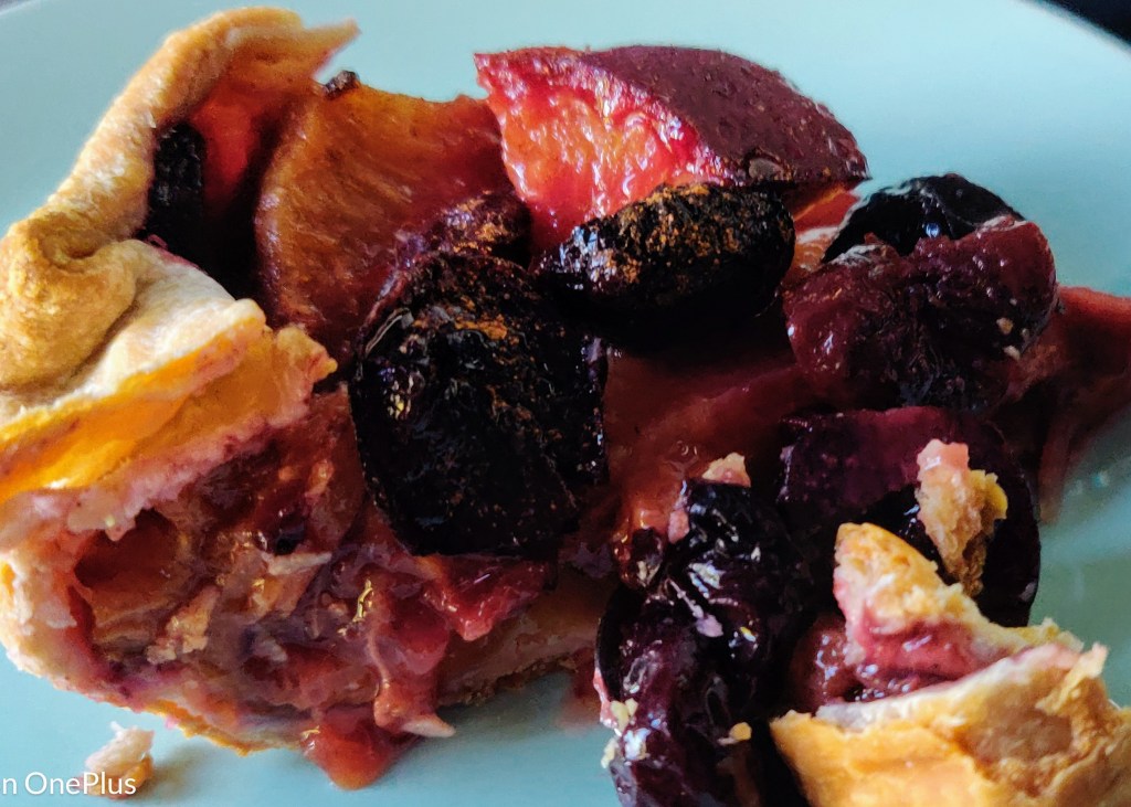 Tarta cu fructe a fost făcută din resturi: cocă de la Fry’s, 2 piersici mari, de Utah, încă nefleoșcăite, 3 prune mari, 1/3 pungă cu cireșe congelate. Un pliculeț de zahăr vanilat și un praf de scorțișoară. Nici un alt îndulcitor că nu place la cocoane. La cuptor 40 minute la 400 F.