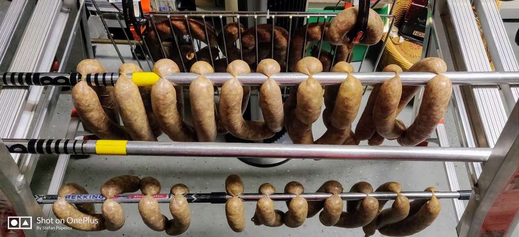 Altfel, regula de trei simplă la greu, fără să mă abat de la proporții. Tocat, băgat în maț, pus la odihnit/presat pe un fund de lemn. Au fost gata la 5:20 am. Se vor odihni până la 8 seara, când vor fi legați /presați între două grătare și puși la ventilator în garaj.