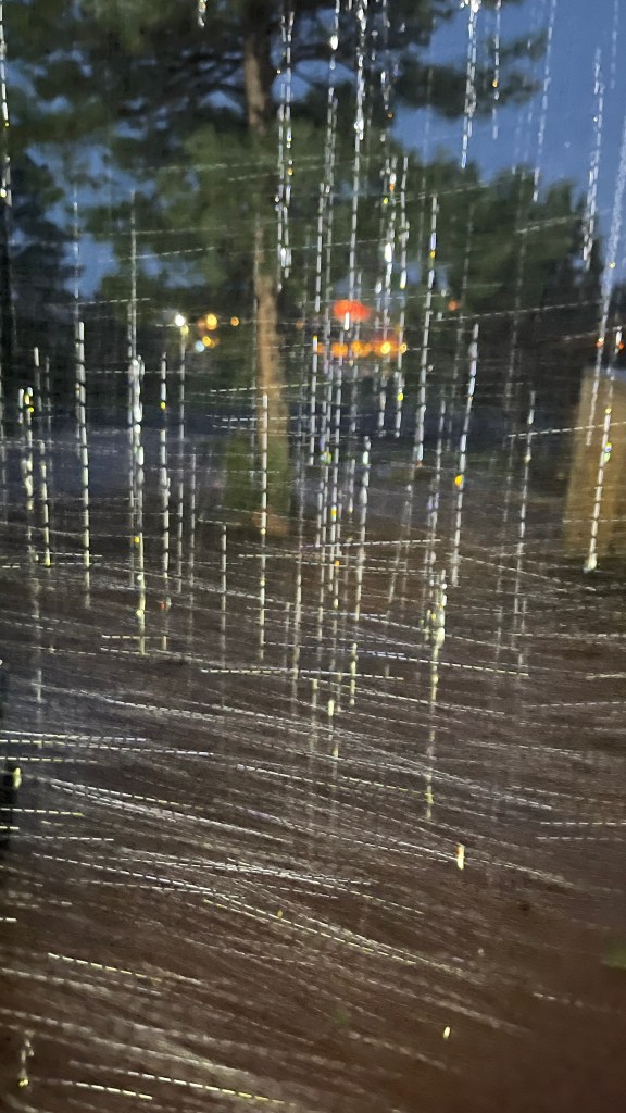 Cum am făcut poza, am fost întrebat: am închis luminile de pe prispă, s-a făcut întuneric beznă, am aprins lanterna cea foarte puternică și am îndreptat-o către copac. Ploua orizontal, dar picăturile verticale erau de la streașină. Luminile din zare erau de la Bison Ranch, de peste drum (260).