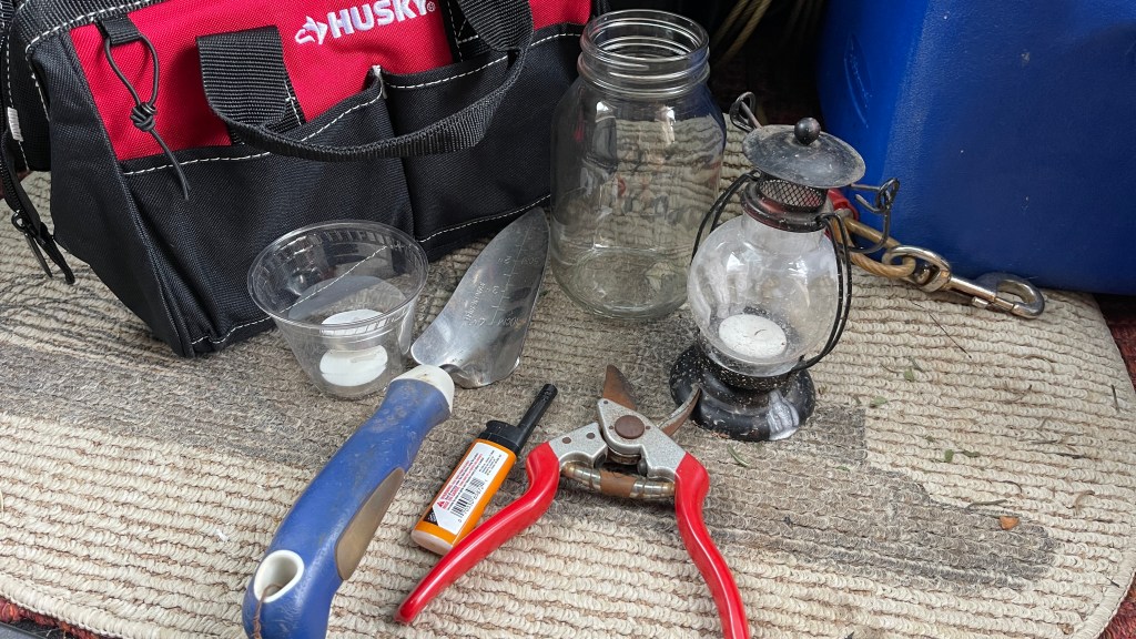Pentru că nu am sacoșică albastră mi-am luat o super gentuță, cu lopățică, forfecuță, borcan de apă, și un super felinar, cadou de la Tata. Bineînțeles, lumânări și o brichetă. Între timp, am înlocuit borcanul cu o sticlă de Borsec, de un litru jumătate, cu capacul găurit, ca să am o stropitoare improvizată.