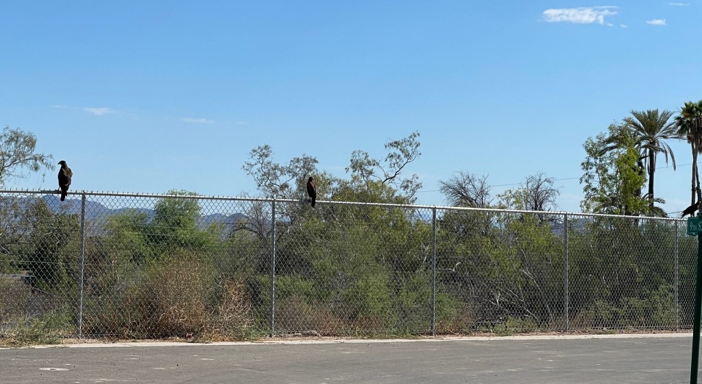 Usually there are some small, singing birds, and lots of crows. But this was a first. They came, looked at us, and when we left, they left, too.
