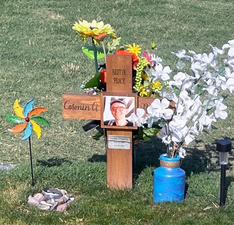 Acum, dacă te uiți cu atenție la crucea decorativă, poți observa o placă metalică pe care scrie, din nou, numele lui, dar are și cele două dăți (când a venit și când a plecat). Scopul acestei plăci este acela de a acoperi data nașterii și data plecării. Data de naștere originală, pe cruce, era 1 Mai, conform instrucțiunilor mele. Greșit!