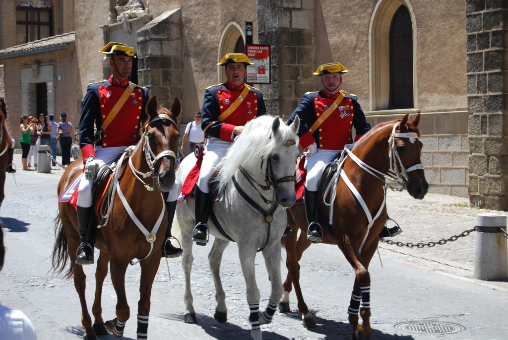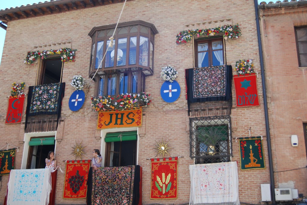 Toledo ’s streets are clothed in finery to celebrate the feast of Corpus Christi: a solemn procession which takes place in an atmosphere of singing, the aroma of herbs, and spiritual fervour. (source: https://www.spain.info/en/calendar/corpus-christi-toledo/)