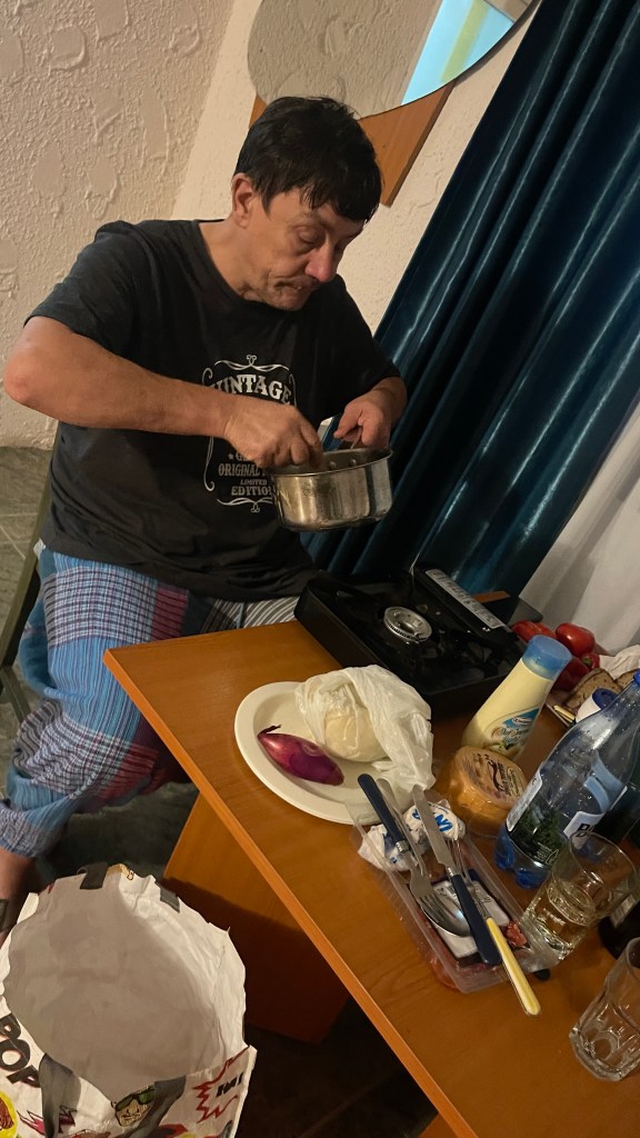 Incredibil, dar camera pe care am primit-o era un alt apartament matrimonial (cred că de fapt doar asta aveau), pe două nivele, cu scară interioară … tot ce ne interesa era un duș fierbinte și un pat bun. Sau așa am crezut, Mișu a trebuit să gătească exact în mijlocul camerei, era înfometat și foarte însetat. Dar mai ales înfometat. Eu eram însetat.