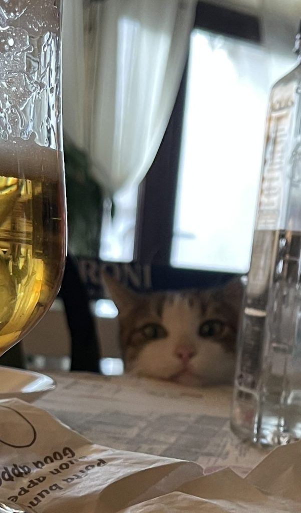 Că tot a venit vorba de restaurante, am intrat cu Anca la un restaurant mititel, de cartier, Bistro HB. Ni-l recomandase un tânăr care fuma entuziast în fața unui restaurant închis, păzea ușa. Pe Mătăsari e o salbă de restaurante, la unele am fost anii trecuți, altele nou apărute. La Bistro nu fusesem, ne-a plăcut. Aveau mâncare bună, niște găluște cu prune, de concurs, prețurile decente, ciubucul, ca de obicei, în cash (nici nu mai trebuie să spun). Când a apărut și o pisicuță care s-a așezat cuminte pe scaun lângă noi, la masă, m-am topit.
