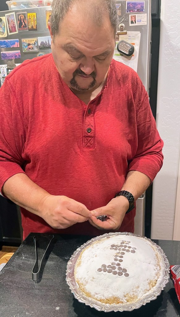 5:30 am – cu coliva declarată “bună”, am trecut la ornat și făcut crucea. Ca de obicei, a ieșit strâmbă. Mi s-a atras discret atenția că nu are bordură. Am zis că mea culpa și am făcut bordură. Cred că îmi trebuie o pensetă, deși se pare că orice aș face, tot urât iese. Părerea mea. Irina continuă să mă încurajeze și zice că e bine.