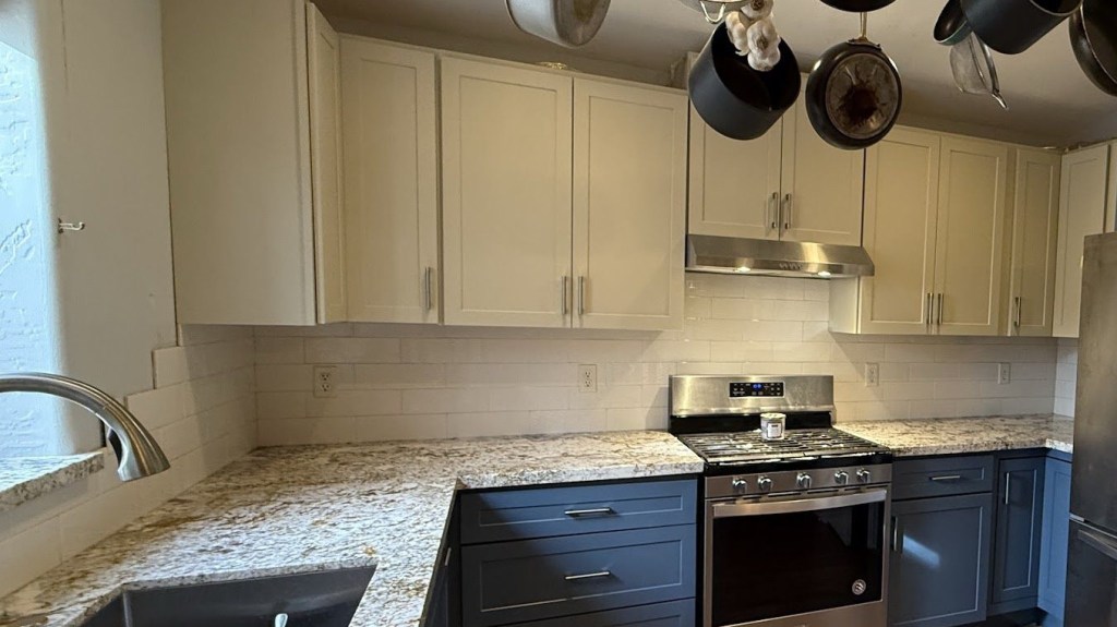 Și când credem noi că totul e gata, de la dulapul îngust + trei săptămâni vin iar niște specialiști să ne pună backsplash-ul, adică niște mini faianță care dă frumos la ochi, din categoria “hai să-i futem o dungă roșie!”