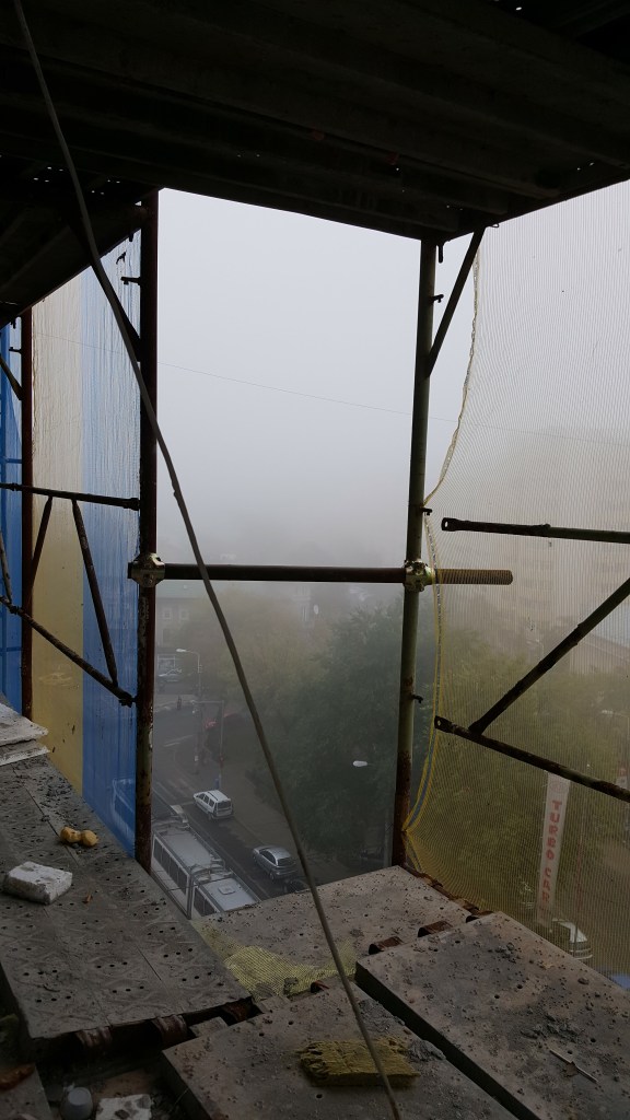 Prin 2016, pe la sfârșitul lui august, au început ăștia să anvelopeze blocul; nu știu care e numele oficial al procedurii (nici nu știu precis cum se scrie), ceva cu reabilitare termică, program sponsorizat de UE. Apar eu în București, schelele erau deja în jurul blocului, băieții lucrau de mama focului, sau cel puțin așa credeam eu.