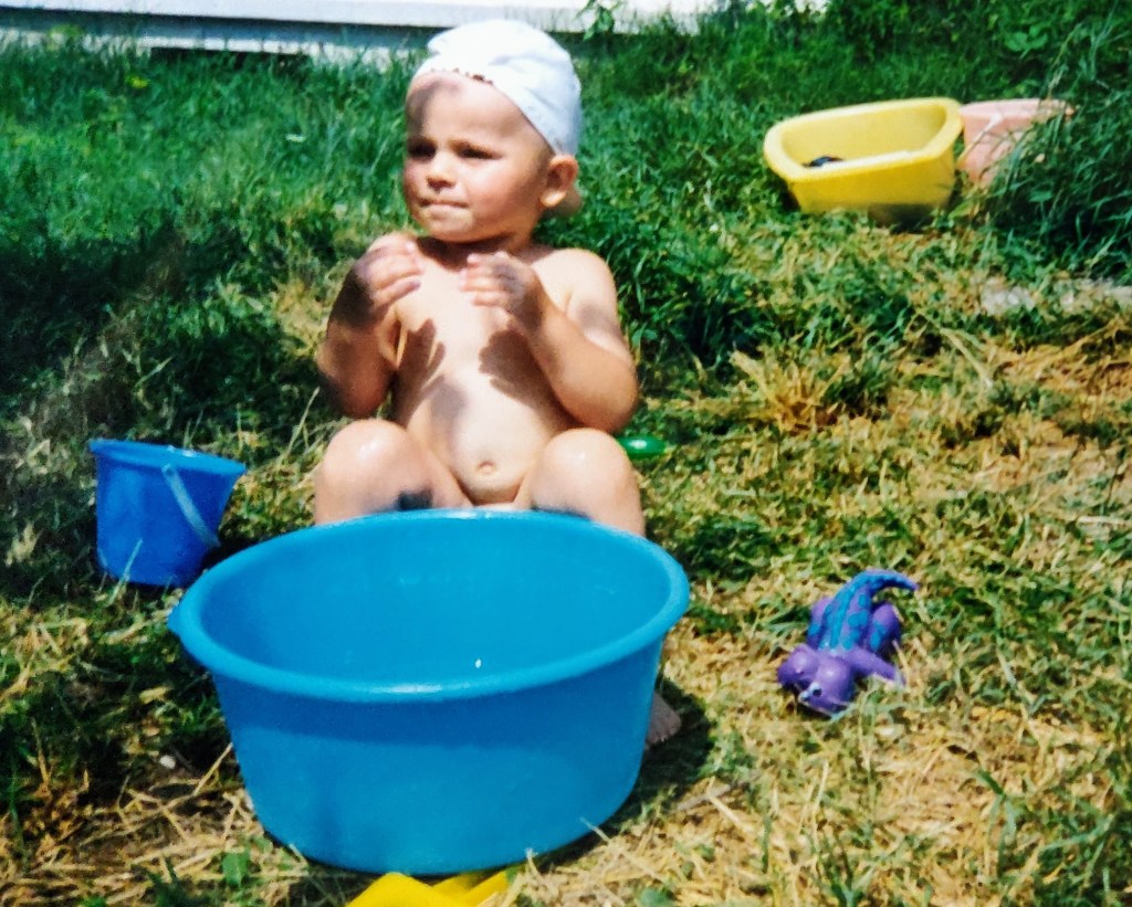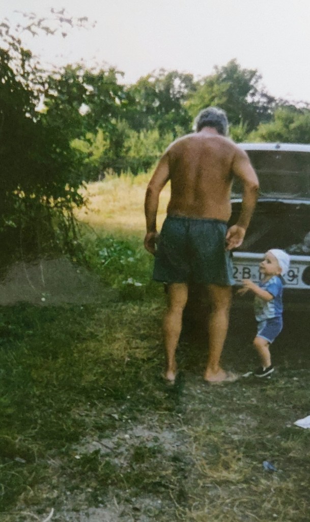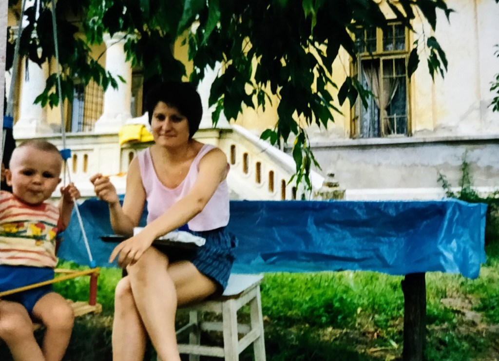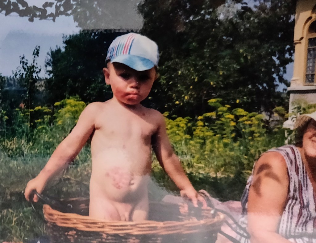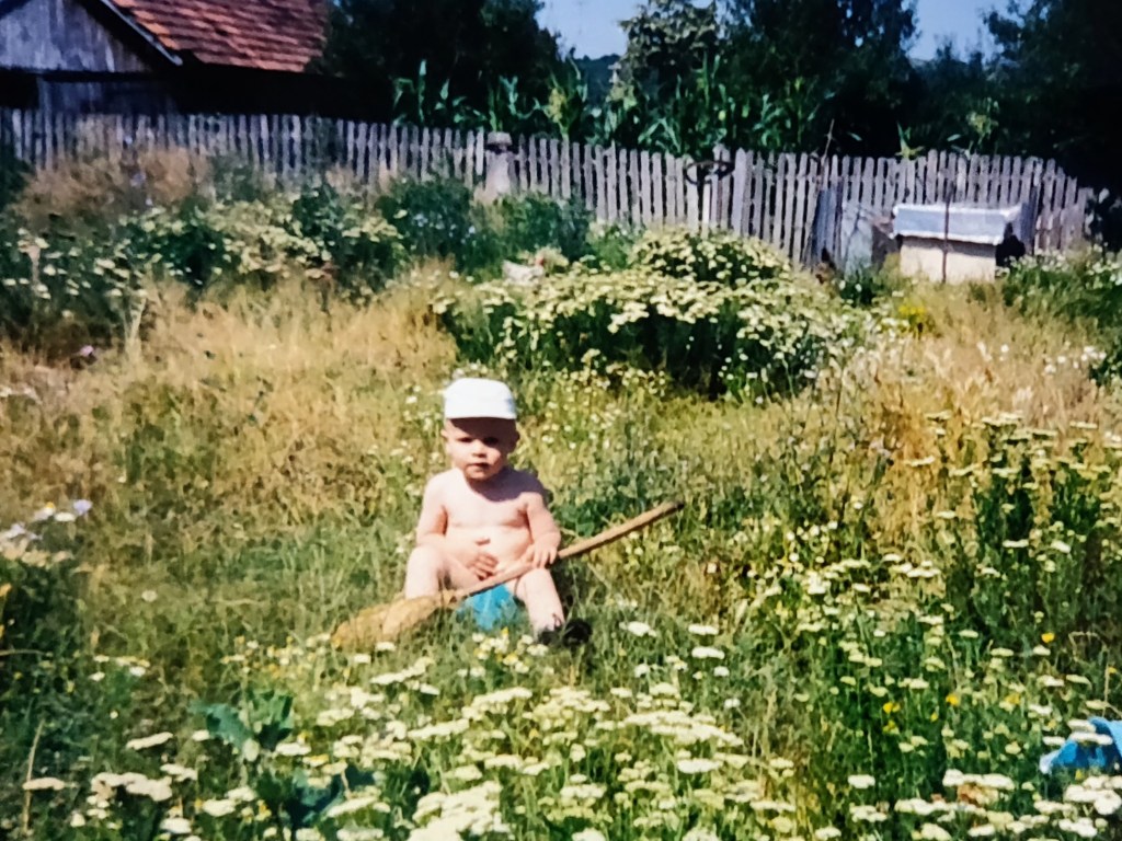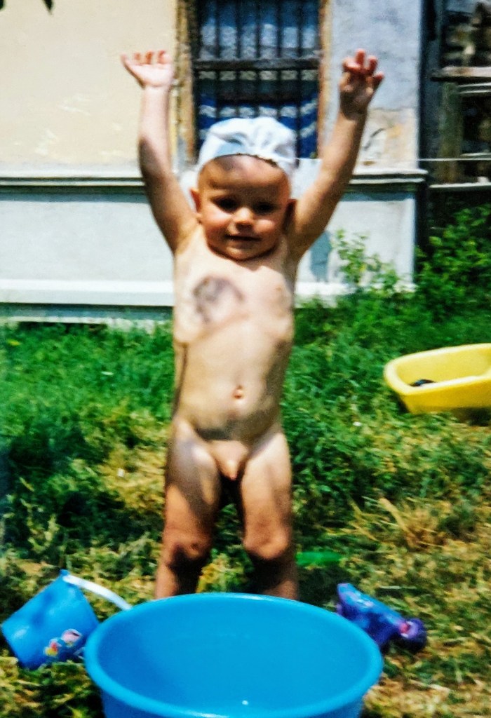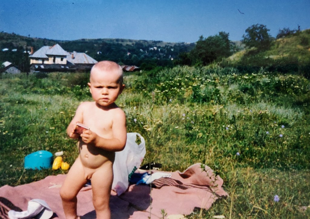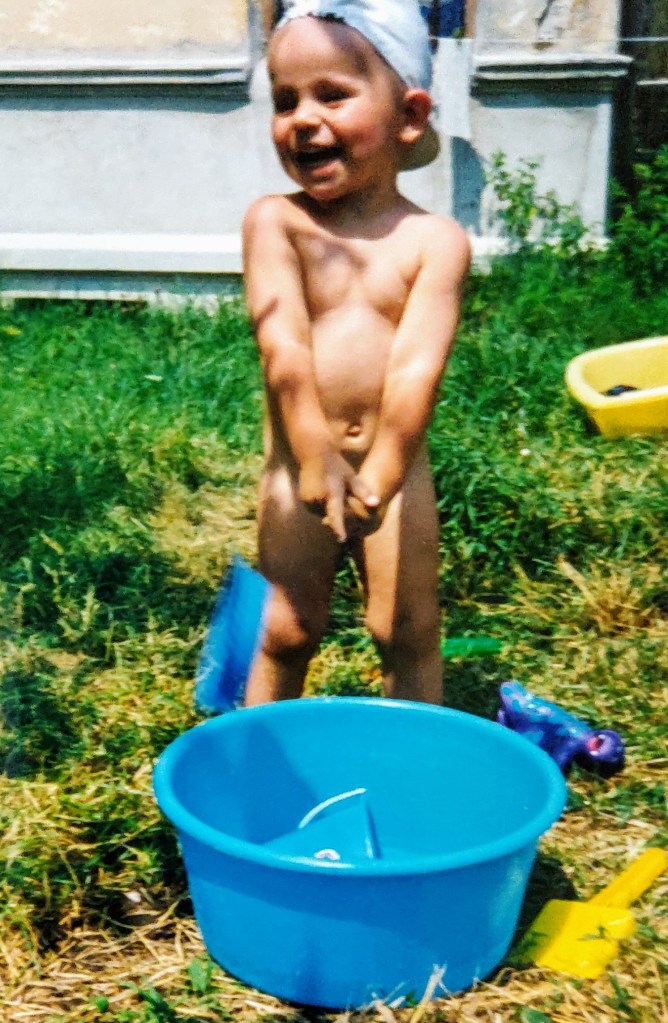 Cosmin avea 2 ani și puțin. Ai mei l-au luat aproape toată vara la Hulubești și Mama îl ținea în fundul gol toată ziua să-l dezvețe de pamperși.