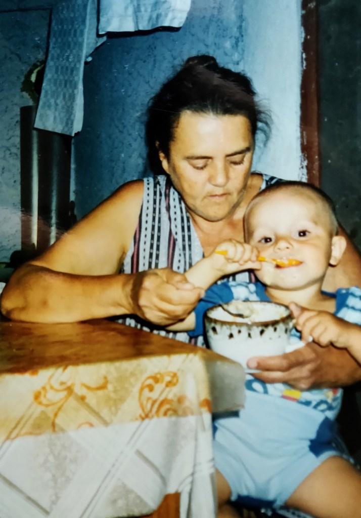 "Ah, ce bună e păpița!" "Nu mânca și lingurița. Te ajută și Bunica Să terminăm azi păpica."